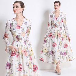Primavera nueva manga larga Patchwork Floral Knit Top plisado estampado Midi vestido largo con cintura Natural y decoración de fajas