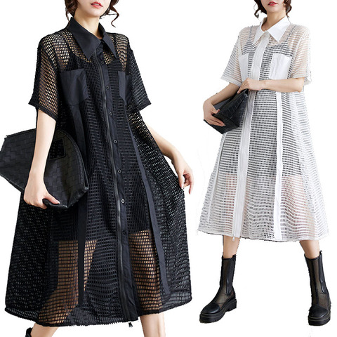 Летнее модное платье миди из натуральной ткани с воротником-рубашкой, коротким рукавом, прозрачное, на молнии, из сетки, можно стирать