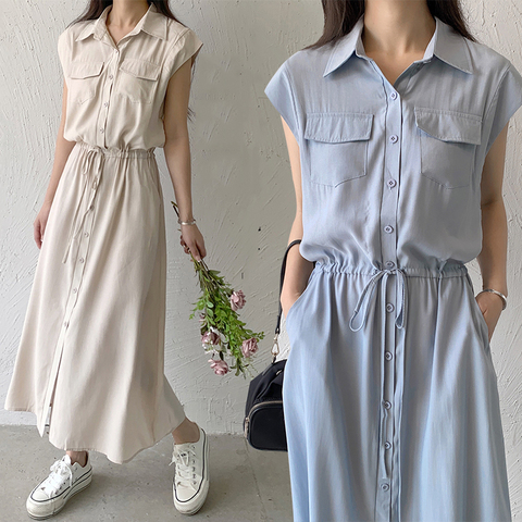 Женское летнее модное платье миди, Лидер продаж, Повседневная Длинная рубашка без рукавов, воротник, однотонный узор, украшение на пуговицах, естественная Моющаяся