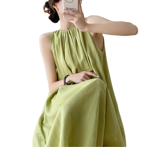 Летнее повседневное льняное платье миди ODM для женщин, 100% натуральное тканое, без рукавов, с круглым вырезом, однотонное, моющееся, модное